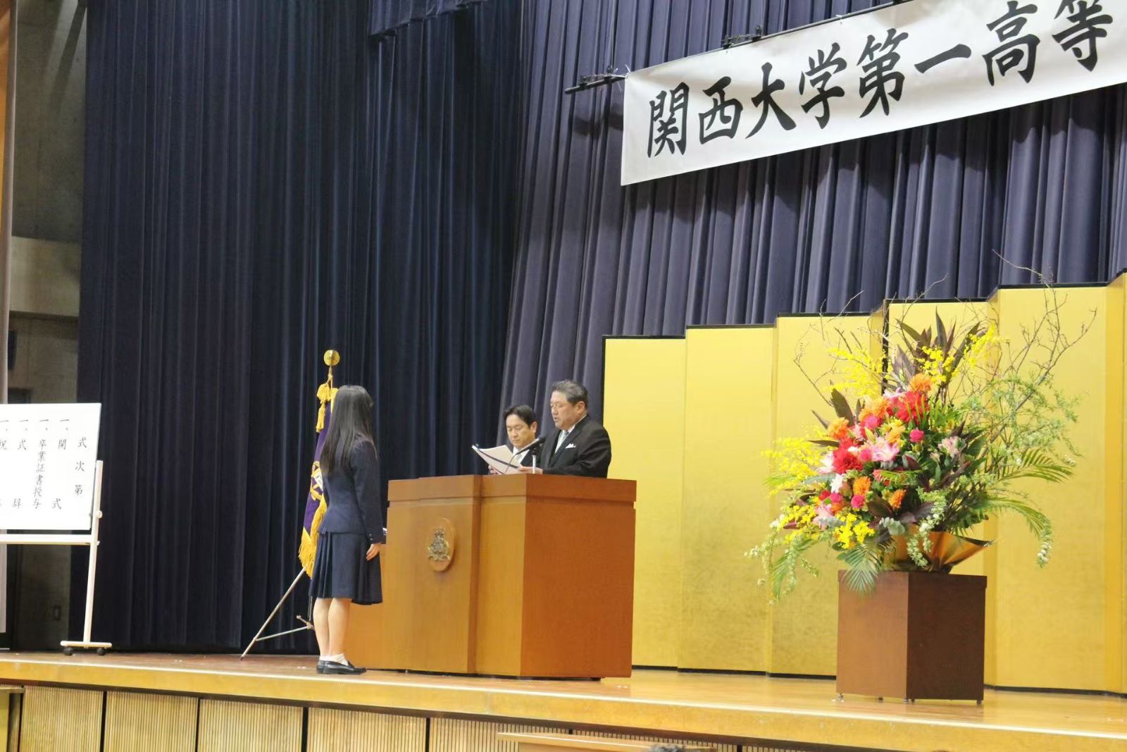 关西大学附属第一高等学校于1月29日隆重举行了2024年度毕业典礼。众多家长齐聚一堂,共同见证了这激动人心的时刻。今年,共有381名毕业生满怀憧憬,踏上了人生的新征程。各班级的毕业生代表在被点名时,带着些许紧张与激动,走上讲台,从狩场治秀校长手中接过了象征学业成就的毕业证书。