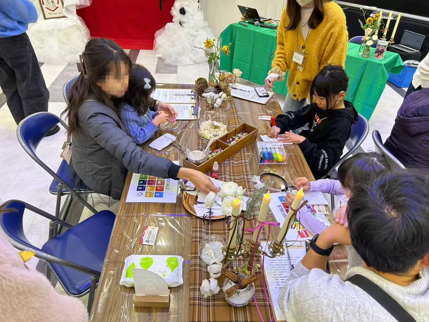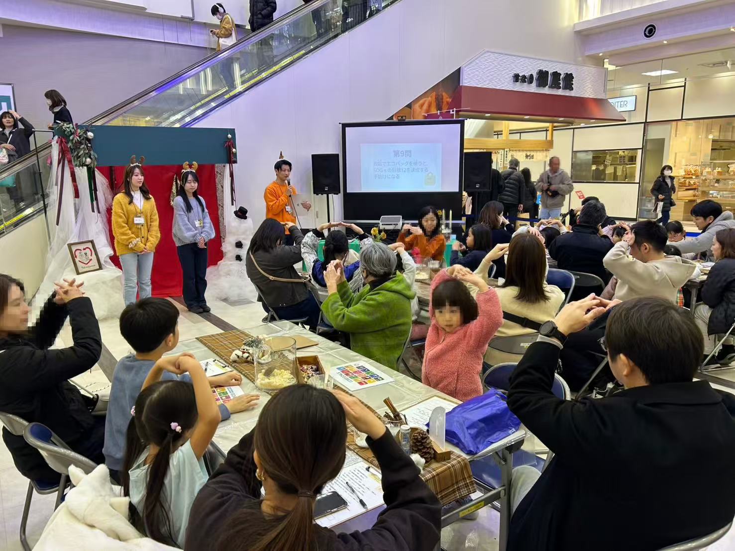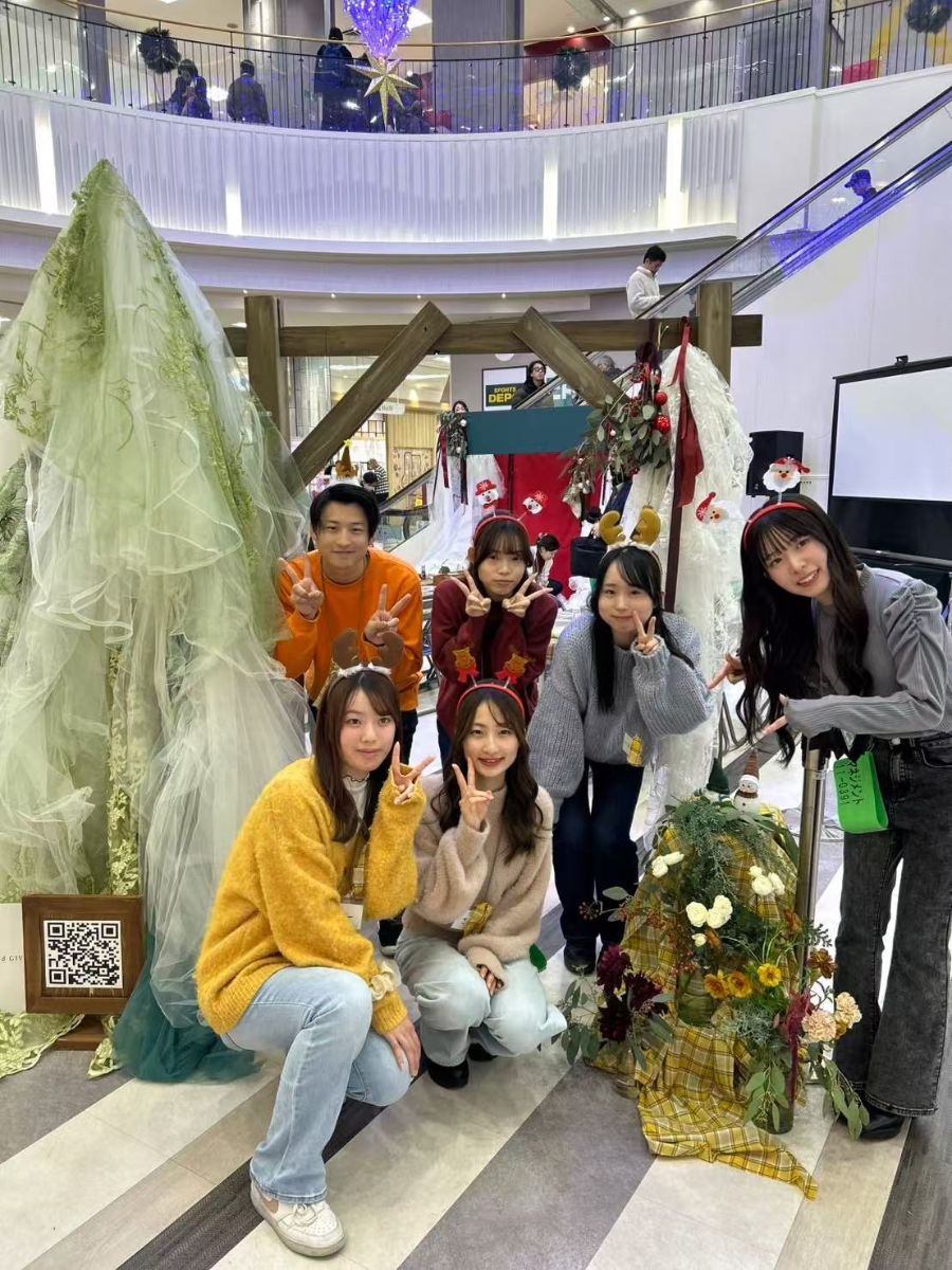 在工作坊开始时,学生们用日常生活中的例子通俗易懂地解释了SDGs(可持续发展目标),并进行了“◯ ×"问答游戏,使大家在乐趣中加深了对SDGs(可持续发展目标)的理解。此外,会场还设置了利用婚礼现场废弃物制作的“圣诞拍照点”,为活动增色不少。