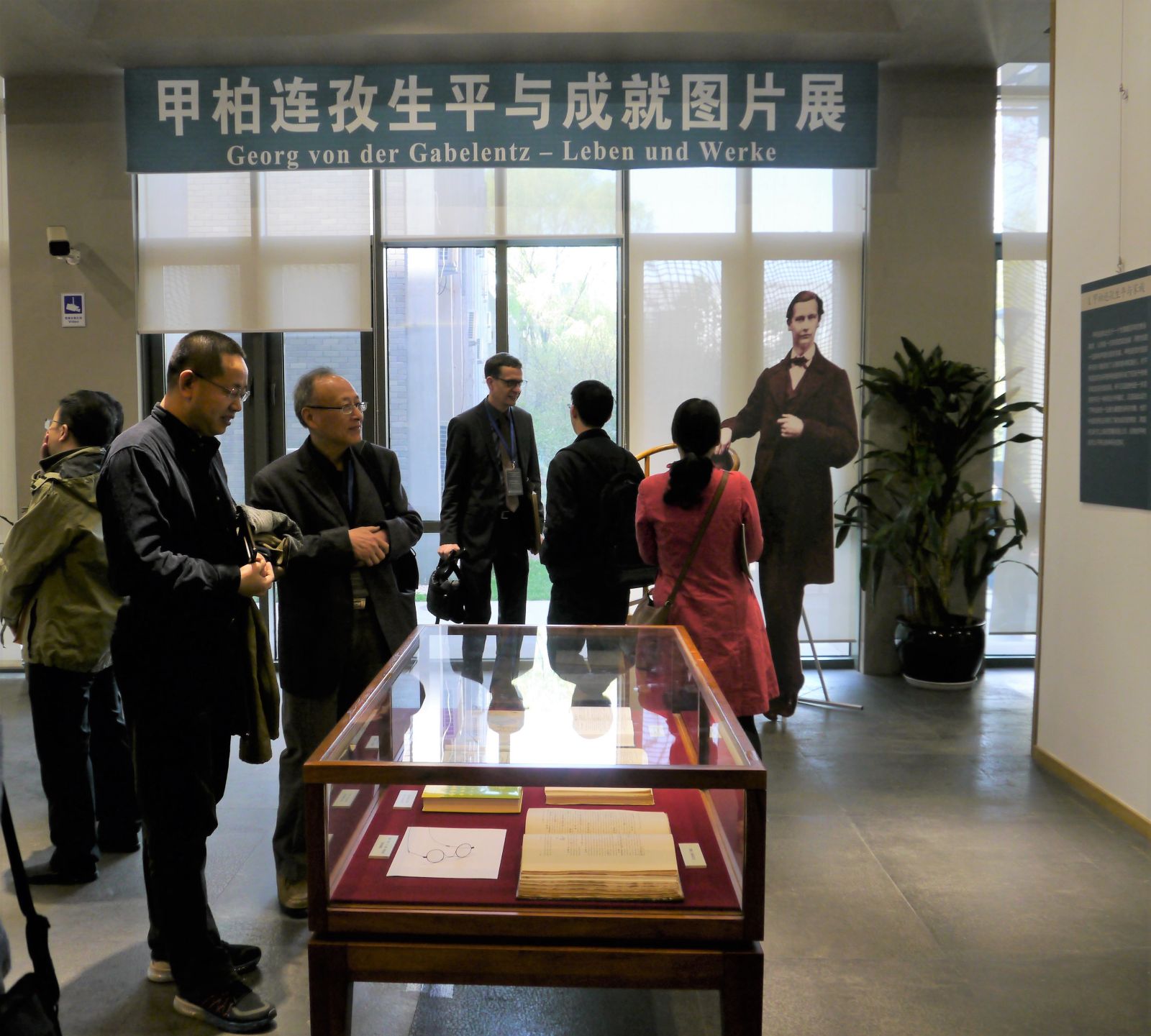 与“甲柏连孜国际学术会议”相辉映,为期半个月的“甲柏连孜:生平与成就图片展”也于2017年3月27日,在北京外国语大学图书馆一层展厅开幕,以图片和实物的形式对甲柏连孜做了全面的介绍。展览中出现的遗物、手稿和照片等珍贵资料,均为甲柏连孜后人所提供,而且这是首次在德国境外亮相。