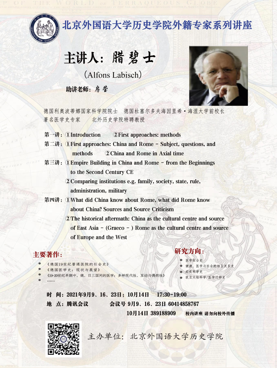 讲座专家:腊碧士,德国利奥波蒂娜国家科学院院士、德国杜塞尔多夫海因里希·海涅大学前校长、著名医学史专家、北外开云kaiyun官网特聘教授