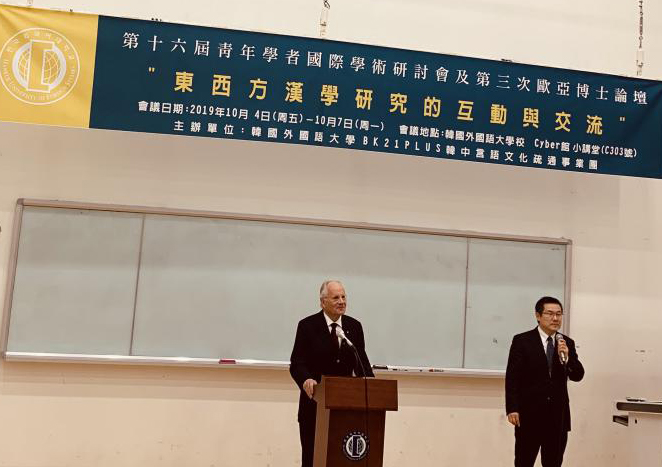 2019年10月4日至7日,「第十六届青年学者国际学术硏讨会」暨「第三届欧亚博士论坛」在首尔韩国外国语大学举行。此次论坛由韩国外国语大学BK21PLUS韩中言语文化疏通事业团、韩国外国语大学中国语大学、韩国外国语大学孔子学院、北京外国语大学、日本关西大学、德国波恩大学等联合主办,主题是“东西方汉学研究的互动与交流”。来自北京外国语大学、四川大学、山东大学、上海大学、延边大学、湖北大学、湖北师范大学、山西大学、青岛科技大学、关西大学、波恩大学(Rheinische Friedrich-Wilhelms-Universität Bonn)、杜赛尔多夫大学(Heinrich-Heine-Universität Düsseldorf)等海内外高校的90多位博士生和指导教授参加论坛。开云官网李雪涛院长和外籍教授腊碧士(Alfons Labisch)携师生一行10人参与了这次会议。